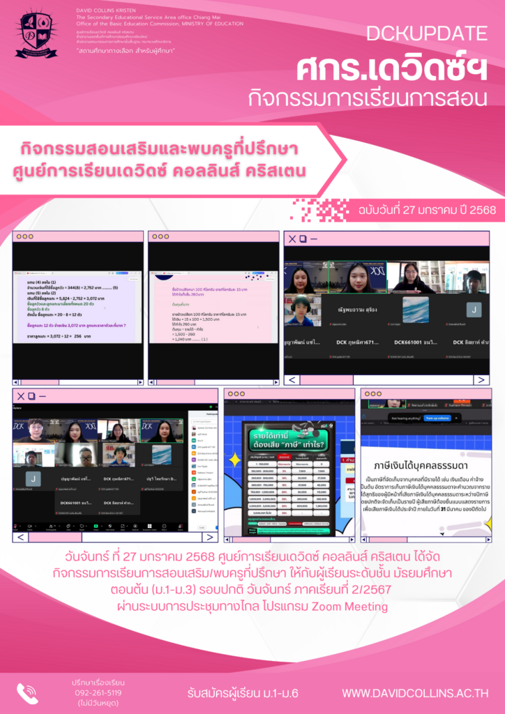 วันจันทร์ ที่ 27 มกราคม 2568 ศูนย์การเรียนเดวิดซ์ คอลลินส์ คริสเตน ได้จัดกิจกรรมการเรียนการสอนเสริม/พบครูที่ปรึกษา ให้กับผู้เรียนระดับชั้น มัธยมศึกษาตอนต้น (ม.1-ม.3) รอบปกติ วันจันทร์ ภาคเรียนที่ 2/2567ผ่านระบบการประชุมทางไกล โปรแกรม Zoom Meeting