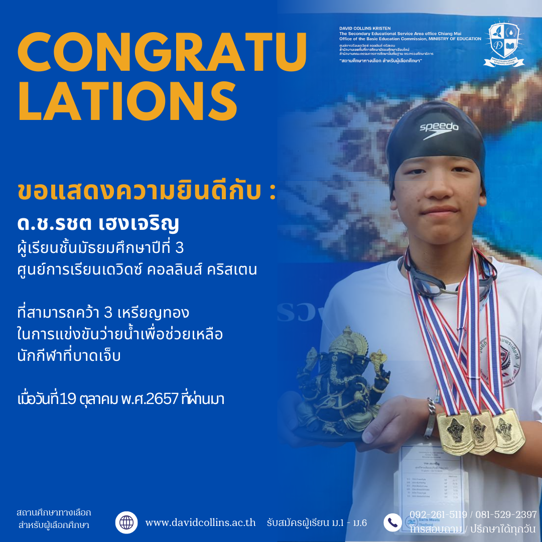 ขอแสดงความยินดีกับ ด.ช.รชต เฮงเจริญ ผู้เรียนชั้นมัธยมศึกษาปีที่ 3 ศูนย์การเรียนเดวิดซ์ คอลลินส์ คริสเตน ที่สามารถคว้า 3 เหรียญทอง ในการแข่งขันว่ายน้ำเพื่อช่วยเหลือนักกีฬาที่บาดเจ็บ เมื่อวันที่ 19 ตุลาคม พ.ศ.2657 ที่ผ่านมา