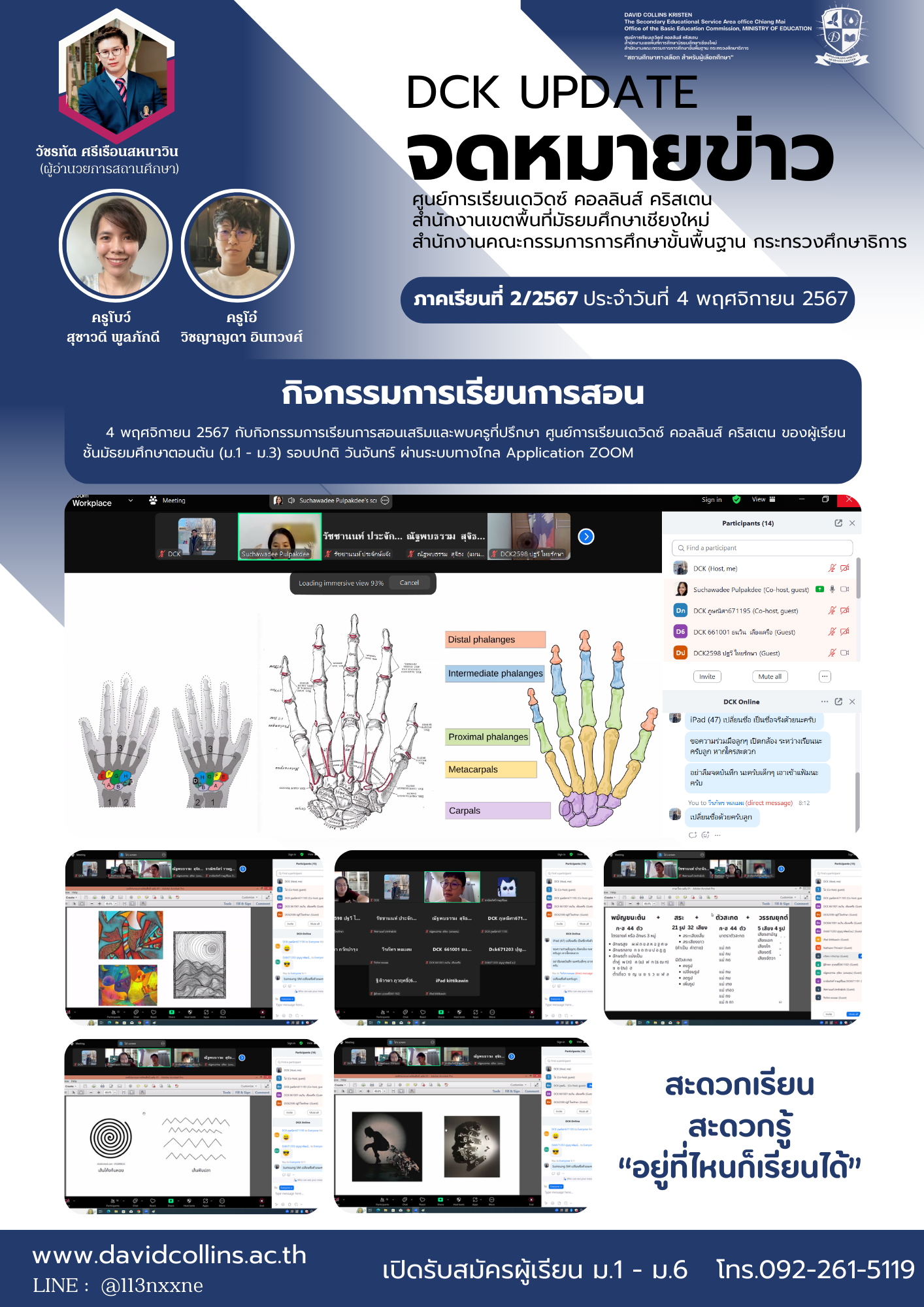 4 พฤศจิกายน 2567 กับกิจกรรมการเรียนการสอนเสริมและพบครูที่ปรึกษา ศูนย์การเรียนเดวิดซ์ คอลลินส์ คริสเตน ของผู้เรียนชั้นมัธยมศึกษาตอนต้น (ม.1 – ม.3) รอบปกติ วันจันทร์ ผ่านระบบทางไกล Application ZOOM