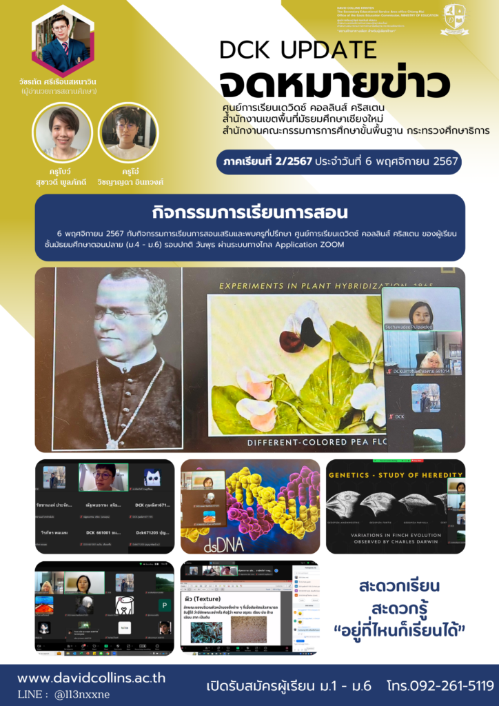 6 พฤศจิกายน 2567 กับกิจกรรมการเรียนการสอนเสริมและพบครูที่ปรึกษา ศูนย์การเรียนเดวิดซ์ คอลลินส์ คริสเตน ของผู้เรียนชั้นมัธยมศึกษาตอนปลาย (ม.4 – ม.6) รอบปกติ วันพุธ ผ่านระบบทางไกล Application ZOOM