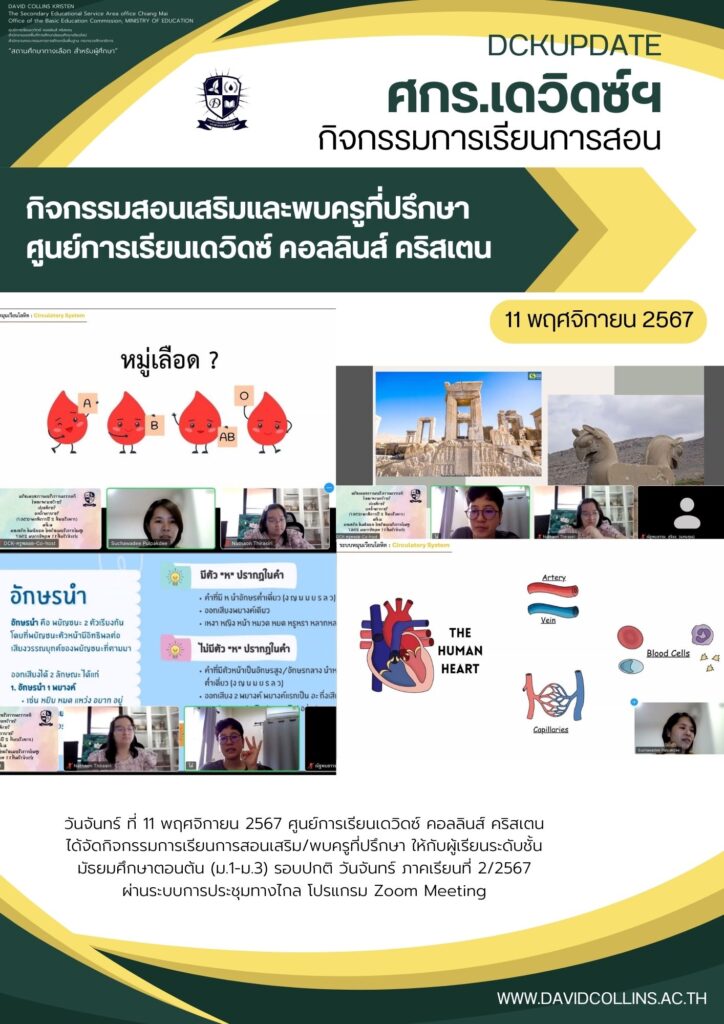 กิจกรรมสอนเสริมและพบครูที่ปรึกษา ศูนย์การเรียนเดวิดซ์ คอลลินส์ คริสเตน วันจันทร์ ที่ 11 พฤศจิกายน 2567 ศูนย์การเรียนเดวิดซ์ คอลลินส์ คริสเตน ได้จัดกิจกรรมการเรียนการสอนเสริม/พบครูที่ปรึกษา ให้กับผู้เรียนระดับชั้นมัธยมศึกษาตอนต้น (ม.1-ม.3) รอบปกติ วันจันทร์ ภาคเรียนที่ 2/2567 ผ่านระบบการประชุมทางไกล โปรแกรม Zoom Meeting