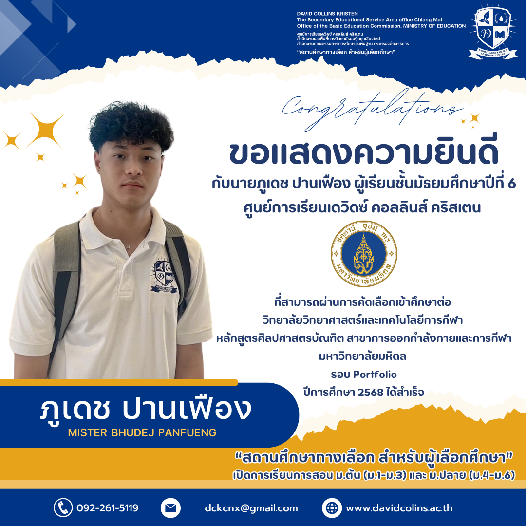 นายภูเดช ปานเฟือง ผู้เรียนชั้นมัธยมศึกษาปีที่ 6 ศูนย์การเรียนเดวิดซ์ คอลลินส์ คริสเตนที่สามารถผ่านการคัดเลือกเข้าศึกษาต่อ วิทยาลัยวิทยาศาสตร์และเทคโนโลยีการกีฬา หลักสูตรศิลปศาสตรบัณฑิต สาขาการออกกำลังกายและการกีฬา มหาวิทยาลัยมหิดล รอบ Portfolio ปีการศึกษา 2568 ได้สำเร็จ