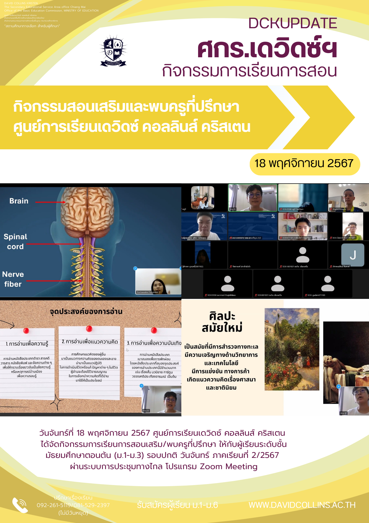 วันจันทร์ที่ 18 พฤศจิกายน 2567 ศูนย์การเรียนเดวิดซ์ คอลลินส์ คริสเตน ได้จัดกิจกรรมการเรียนการสอนเสริม/พบครูที่ปรึกษา ให้กับผู้เรียนระดับชั้นมัธยมศึกษาตอนต้น (ม.1-ม.3) รอบปกติ วันจันทร์ ภาคเรียนที่ 2/2567 ผ่านระบบการประชุมทางไกล โปรแกรม Zoom Meeting