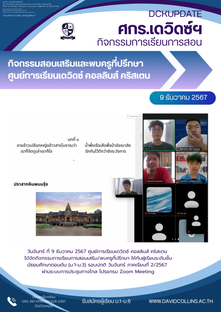 วันจันทร์ ที่ 9 ธันวาคม 2567 ศูนย์การเรียนเดวิดซ์ คอลลินส์ คริสเตน ได้จัดกิจกรรมการเรียนการสอนเสริม/พบครูที่ปรึกษา ให้กับผู้เรียนระดับชั้น มัธยมศึกษาตอนต้น (ม.1-ม.3) รอบปกติ วันจันทร์ ภาคเรียนที่ 2/2567 ผ่านระบบการประชุมทางไกล โปรแกรม Zoom Meeting