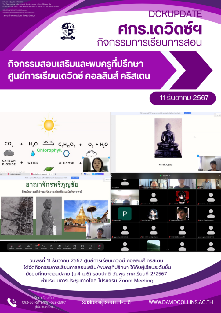 วันพุธที่ 11 ธันวาคม 2567 ศูนย์การเรียนเดวิดซ์ คอลลินส์ คริสเตน ได้จัดกิจกรรมการเรียนการสอนเสริม/พบครูที่ปรึกษา ให้กับผู้เรียนระดับชั้น มัธยมศึกษาตอนปลาย (ม.4-ม.6) รอบปกติ วันพุธ ภาคเรียนที่ 2/2567 ผ่านระบบการประชุมทางไกล โปรแกรม Zoom Meeting