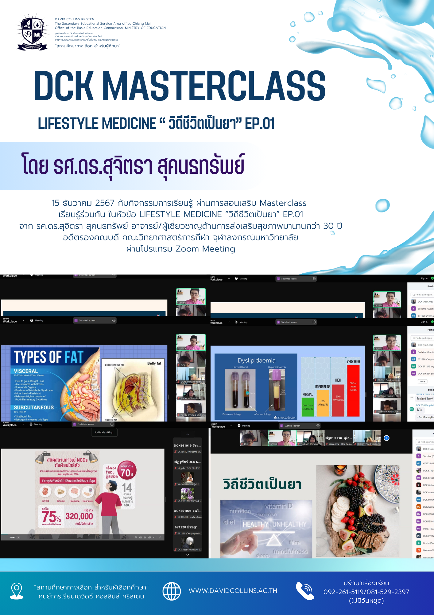 15 ธันวาคม 2567 กับกิจกรรมการเรียนรู้ ผ่านการสอนเสริม Masterclass เรียนรู้ร่วมกัน ในหัวข้อ “วิถีชีวิตเป็นยา” Ep.01จาก รศ.ดร.สุจิตรา สุคนธทรัพย์ อาจารย์/ผู้เชี่ยวชาญด้านการส่งเสริมสุขภาพมานานกว่า 30 ปี อดีตรองคณบดี คณะวิทยาศาสตร์การกีฬา จุฬาลงกรณ์มหาวิทยาลัย ผ่านโปรแกรม Zoom Meeting