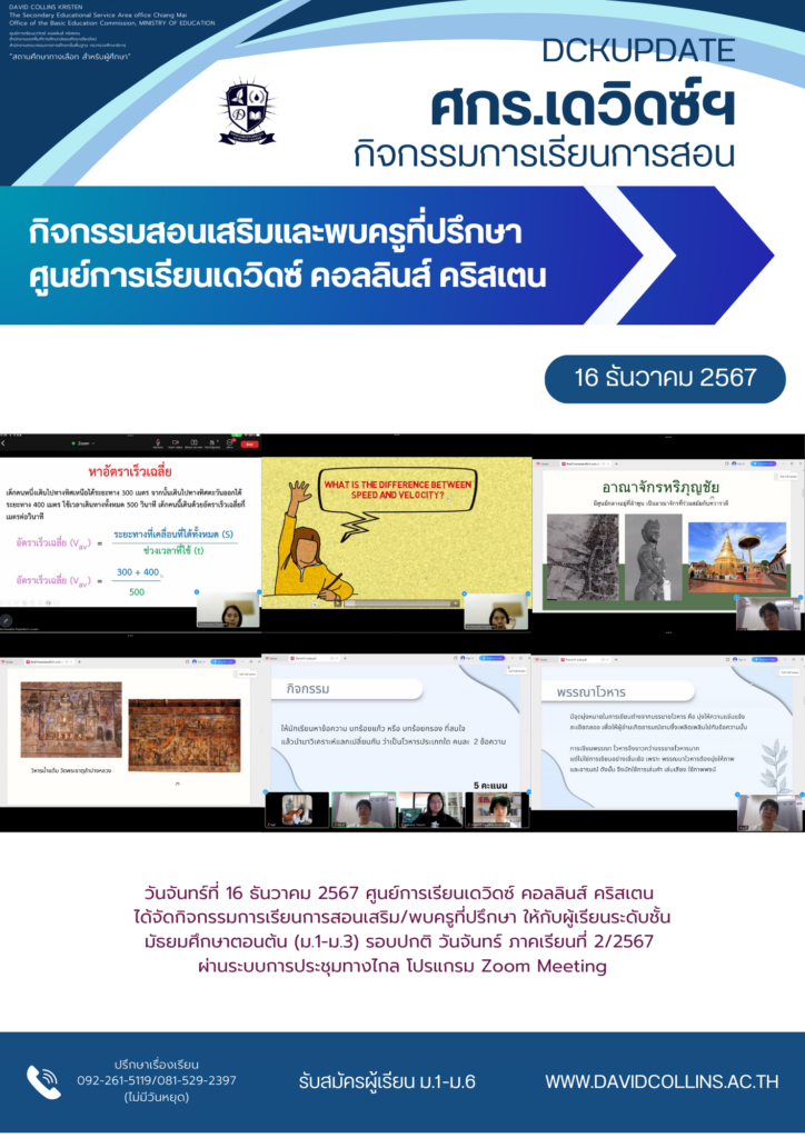 วันจันทร์ที่ 16 ธันวาคม 2567 ศูนย์การเรียนเดวิดซ์ คอลลินส์ คริสเตน ได้จัดกิจกรรมการเรียนการสอนเสริม/พบครูที่ปรึกษา ให้กับผู้เรียนระดับชั้นมัธยมศึกษาตอนต้น (ม.1-ม.3) รอบปกติ วันจันทร์ ภาคเรียนที่ 2/2567 ผ่านระบบการประชุมทางไกล โปรแกรม Zoom Meeting