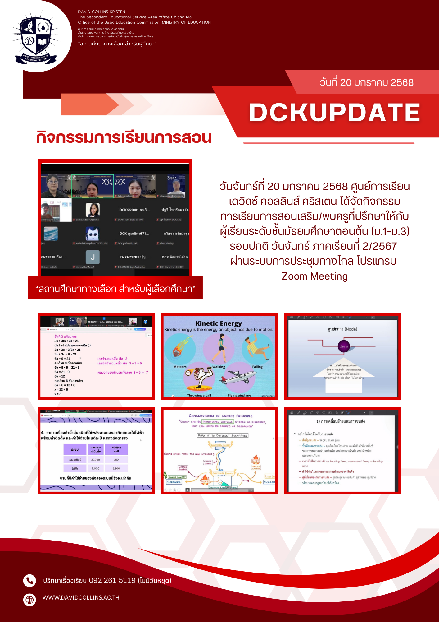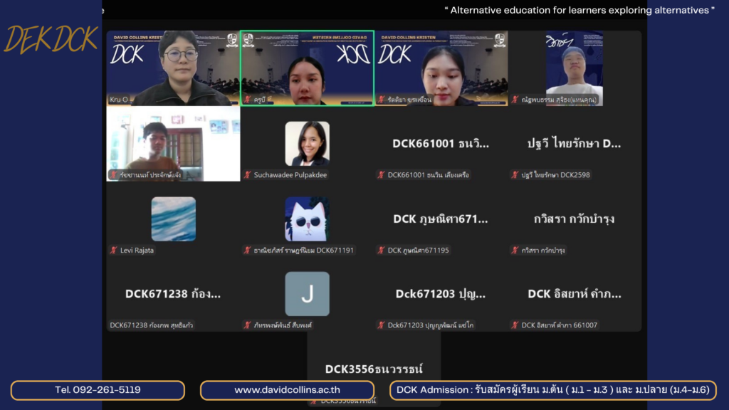 วันจันทร์ ที่ 20 มกราคม 2568 ศูนย์การเรียนเดวิดซ์ คอลลินส์ คริสเตน ได้จัดกิจกรรมการเรียนการสอนเสริม/พบครูที่ปรึกษา ให้กับผู้เรียนระดับชั้นมัธยมศึกษาตอนต้น (ม.1-ม.3) รอบปกติ วันจันทร์ ภาคเรียนที่ 2/2567 ผ่านระบบการประชุมทางไกล โปรแกรม Zoom Meeting
