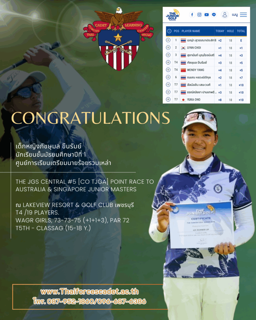 ขอแสดงความยินดีกับเด็กหญิงภัชษุมล ขืนรัมย์ นักเรียนชั้นมัธยมศึกษาปีที่ 1 ศูนย์การเรียนเตรียมนายร้อยรวมเหล่า แข่งขันกีฬากอล์ฟ The JGS Central #5 [CO TJGA] Point Race to Australia & Singapore Junior Masters ณ Lakeview Resort & Golf Club เพชรบุรี T4 /19​ players. WAGR Girls, 73-73-75 (+1+1+3), Par 72 T5th -​ Class​AG (15-18 y.)