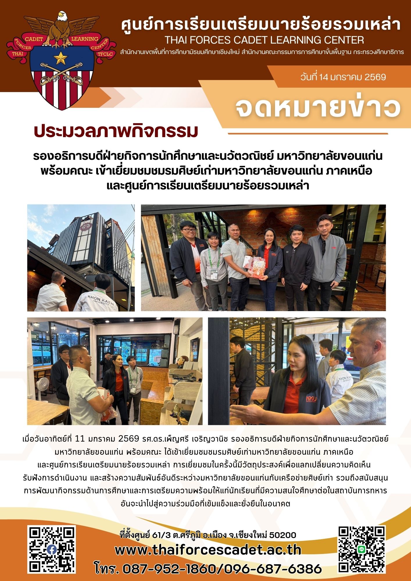 การเยี่ยมชมในครั้งนี้มีวัตถุประสงค์เพื่อแลกเปลี่ยนความคิดเห็น รับฟังการดำเนินงาน และสร้างความสัมพันธ์อันดีระหว่างมหาวิทยาลัยขอนแก่นกับเครือข่ายศิษย์เก่า รวมถึงสนับสนุนการพัฒนากิจกรรมด้านการศึกษาและการเตรียมความพร้อมให้แก่นักเรียนที่มีความสนใจศึกษาต่อในสถาบันการทหาร อันจะนำไปสู่ความร่วมมือที่เข้มแข็งและยั่งยืนในอนาคต