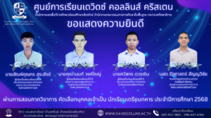 ขอแสดงความยินดีกับนายสัณห์คุณกร สุระสังข์ผู้เรียนชั้นมัธยมศึกษาปีที่ 4 ศูนย์การเรียนเดวิดซ์คอลลินส์ คริสเตน ที่ผ่านการสอบคัดเลือกบุคคลเข้าเป็น นตท.(ทบ.) ประจำปีการศึกษา 2568(แบบเฉพาะกลุ่ม) โรงเรียนนายร้อยพระจุลจอมเกล้า Read More